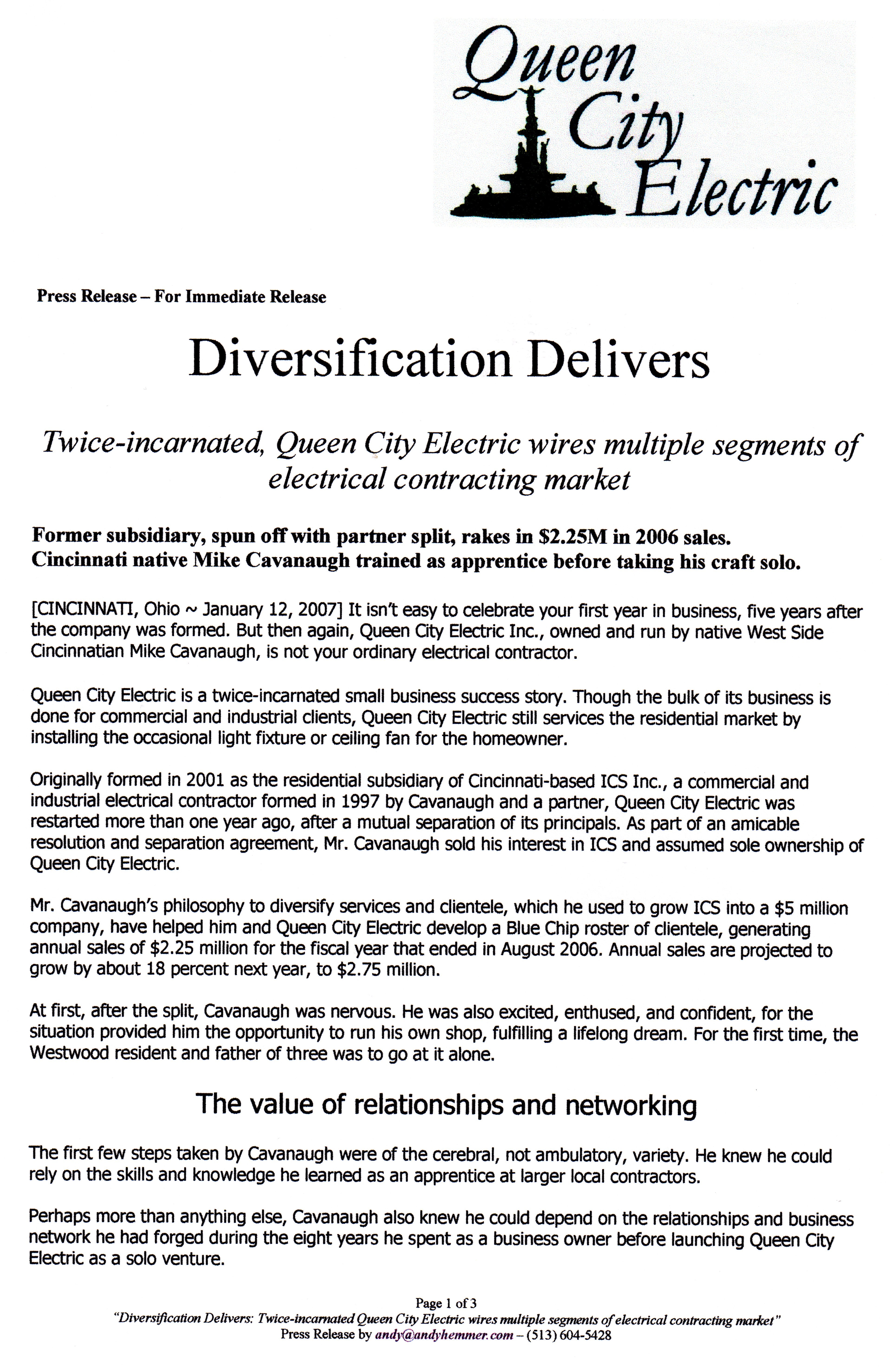 …. and finally, the Queen City Electric press release from 2007, “Diversification Delivers”: