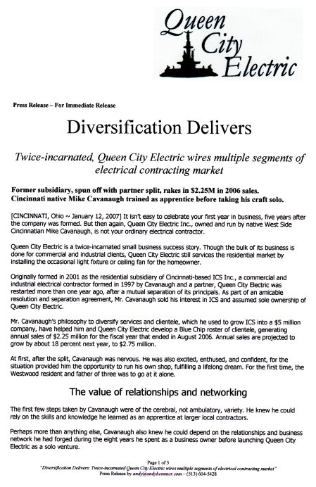 Here’s the Queen City Electric profile from The Cincinnati Business Courier, published in January 2007. Mike’s press release for that PR effort is below the story:
