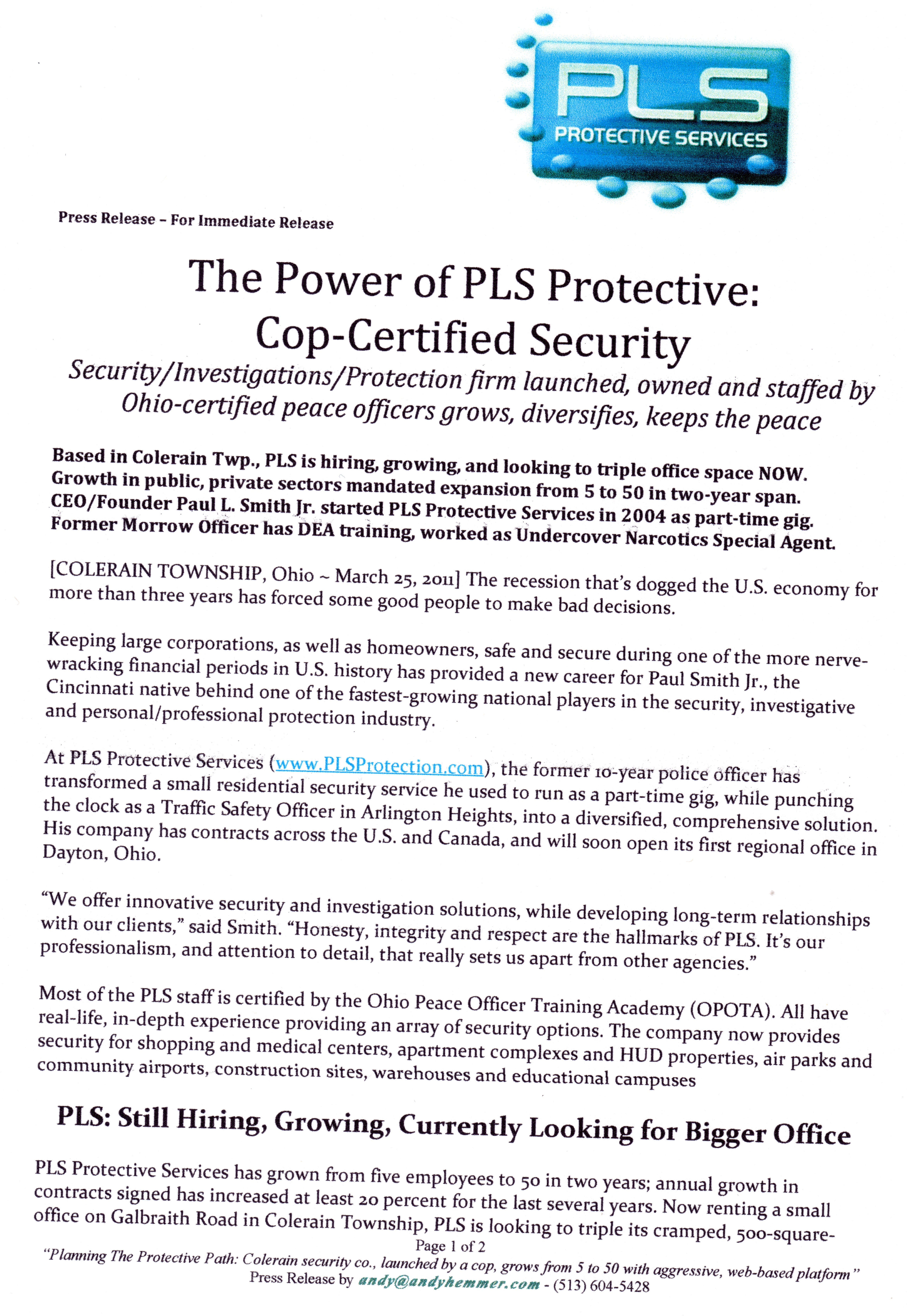 For media inquiries regarding PLS Protective Services, please contact Mr. Andy Hemmer, President of AndyHemmer.com PR at (513) 604-5428 or andy@andyhemmer.com.