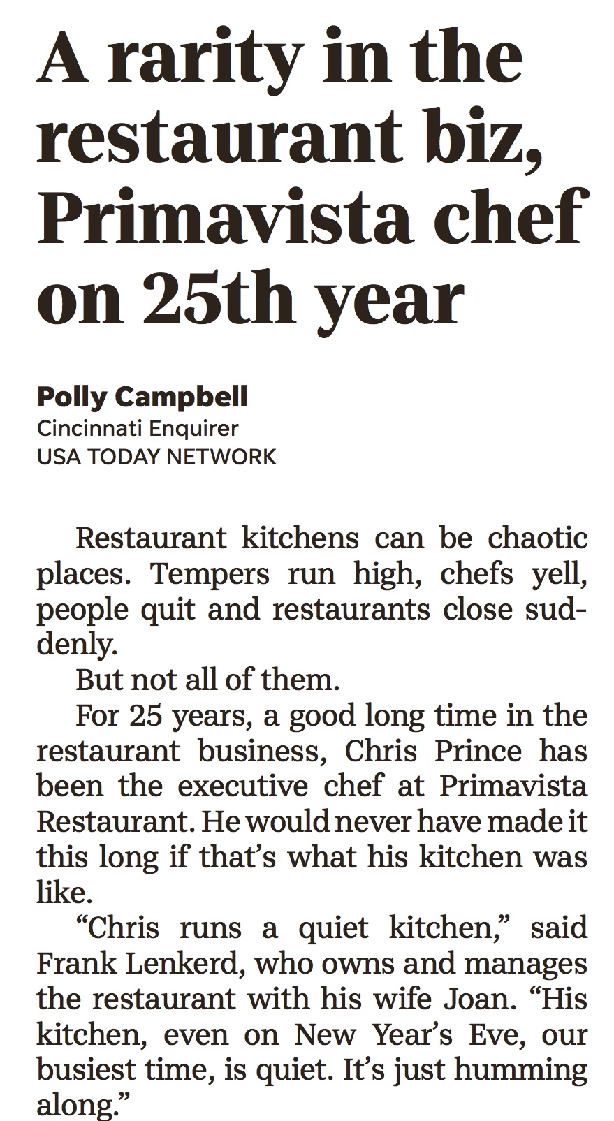 Primavista ~ TODAY IN THE SUNDAY ENQUIRER ~ CINCINNATI ENQUIRER ~ LEAD STORY, BUSINESS SECTION, Page 1F, Sunday December 17, 2017 ~ ‘A Rarity in the Restaurant biz, Primavista Chef on 25th Year’ ~ PR by Andy Hemmer